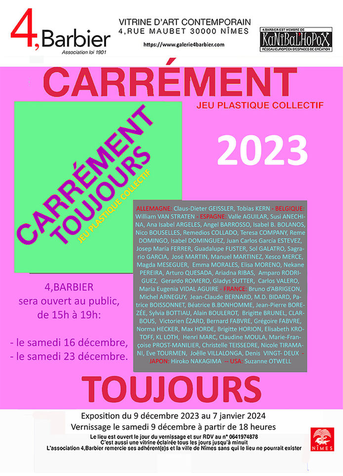 C'est un jeu plastique «à contraintes» que, cette année 2023, 4,BARBIER reprend sous le vocable de CARREMENT TOUJOURS 2023. C’est une exposition de soutien à l’association. 62 artistes